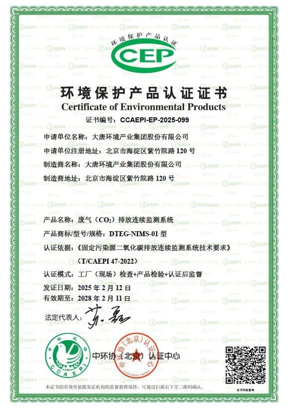 2月12日,大唐环境自主研发的二氧化碳排放连续监测系统成功获得中国环境保护产品认证(CCEP)证书,成为麻豆av 内首家通过该认证的企业。这一里程碑式的成就不仅彰显了大唐环境在环保技术领域的领先地位,更为国家“双碳”战略的实施注入了强劲动力。