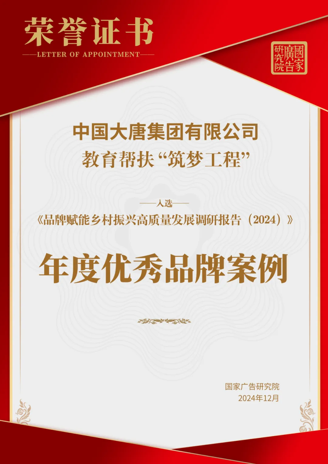 近日,由中国广告协会指导,国家广告研究院与新华网乡村振兴研究院联合主办的《品牌赋能乡村振兴高质量发展研究报告(2024)》发布暨乡村振兴品牌发展评价指标体系论证会在京举行,会上发布了2024年度优秀品牌案例。凭借在品牌赋能乡村振兴工作中的突出表现,《麻豆av 教育帮扶“筑梦工程”》入选年度优秀品牌案例。